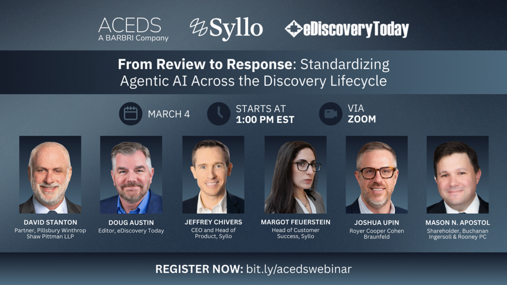 Law firms are using agentic AI broadly across the litigation lifecycle to perform first-level document review and privilege review, prepare written discovery responses, accelerate case preparation, develop strategy, and more. Join us on Wednesday, March 4, at 1pm EST to learn exactly how, in partnership with eDiscoveryToday and the Association of Certified E-Discovery Specialists (ACEDS).
